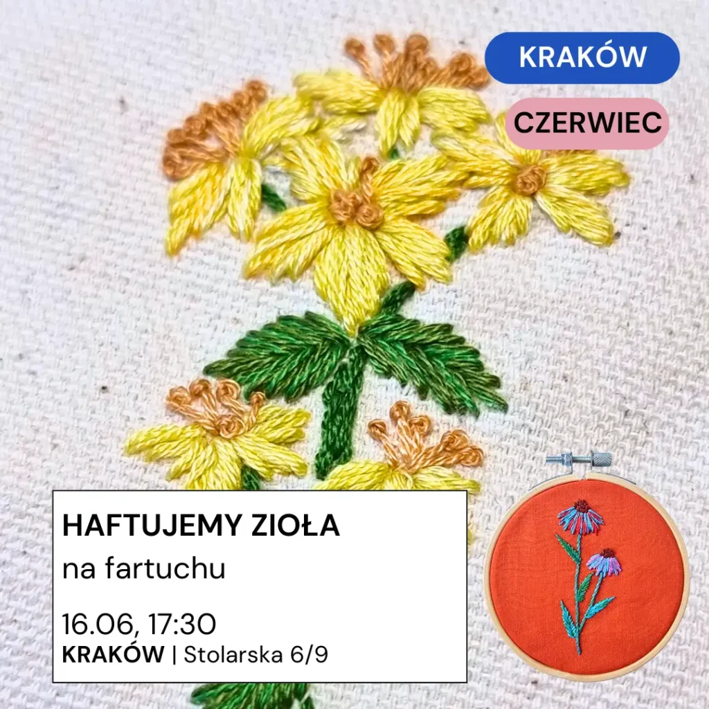 Zapraszam na warsztat haftu! Nauczymy się haftować liście i gałązki na przykładzie jednego z polskich ziół – dziurawca lub wrotyczu. Haftujemy na fartuchu (w cenie warsztatu)